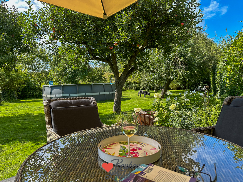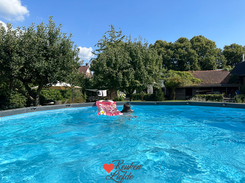 Johan en ik zitten ’s ochtends een paar uurtjes op kantoor voor werkdingen en administratie. Ella fietst naar opa en oma want haar neefje is daar ook. Ik lunch ’s middags met een lekker stokbroodje met ham, kaas en ananas. Ik ben dol op die combi. Eind van de middag duik ik even het zwembad in. Helemaal alleen, even zwemmen en dopperen op een luchtbedje. Genieten.