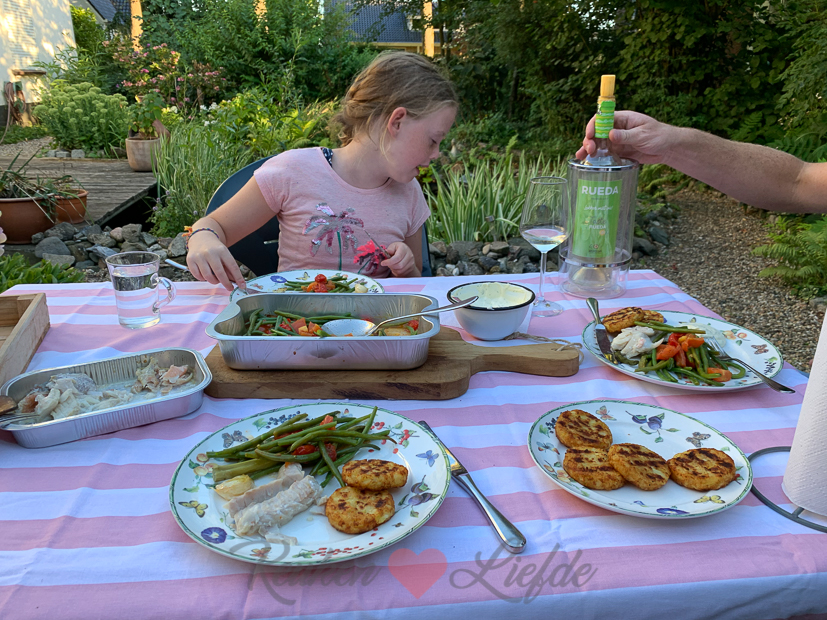 ’s Avonds steken we de barbecue aan. We gooien er vis op uit de Freshly Fish visbox (gemarineerde gamba’s en – volgens mij – zeebaars), wat röstirondjes uit de diepvries en verse sperziebonen uit de moestuin. De vis is al gemarineerd en kan zo op de barbecue. De sperziebonen hebben we kort voorgekookt en doen we daarna in een aluminium barbecuebakje met wat knoflook, olijfolie, cherrytomaatjes en een snuf zeezout. We trekken er een Rueda verdejo wijntje bij open die we vorige week samen met de visbox kregen thuisgestuurd. Zowel de vis als de wijn zijn heerlijk van smaak, maar samen smaken ze nog beter! Echt een feestje dit!
