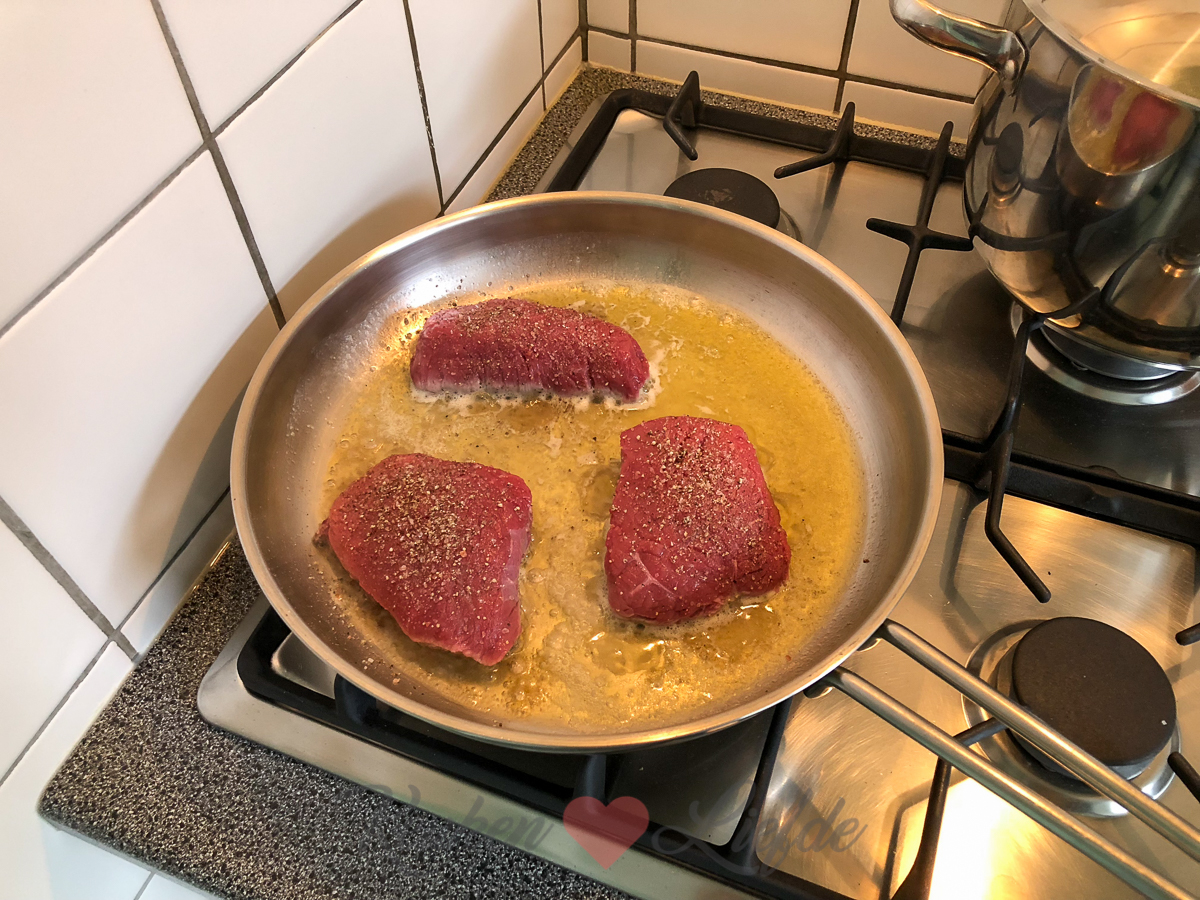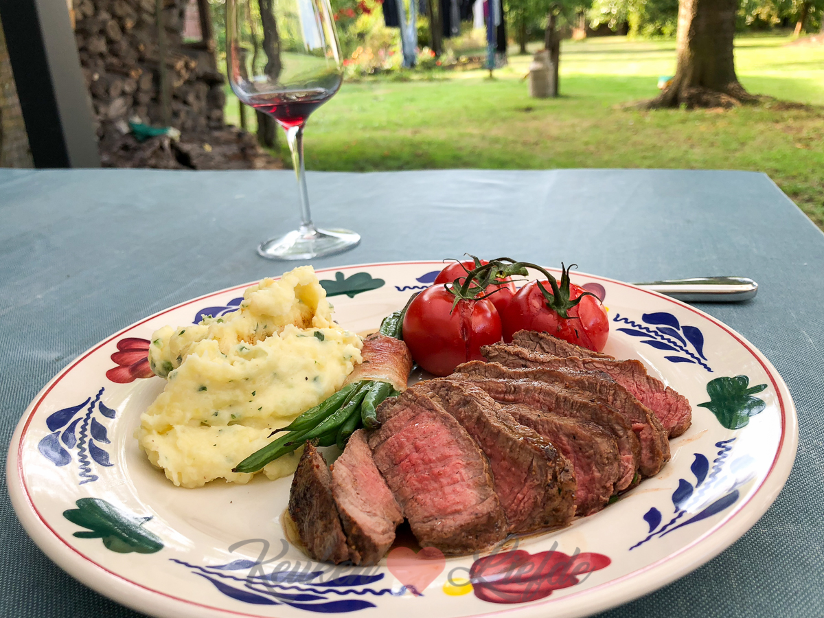 Het normale leven begint langzaamaan weer vorm te krijgen. Hier in Dreumel begint de school weer en Ella-Marie heeft dus haar eerste schooldag in een nieuwe klas. Johan heeft deze week nog vakantie en we hebben de hele week vrijgepland om dozen uit te pakken en klusjes te doen. Ella-Marie mag kiezen wat ze vandaag wilt eten en daar hoeft ze niet lang over na te denken. Biefstuk met puree! (Dit recept.) Erbij maak ik haricots verts rolletjes met spek en gepofte trostomaten uit de oven.