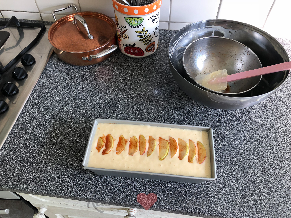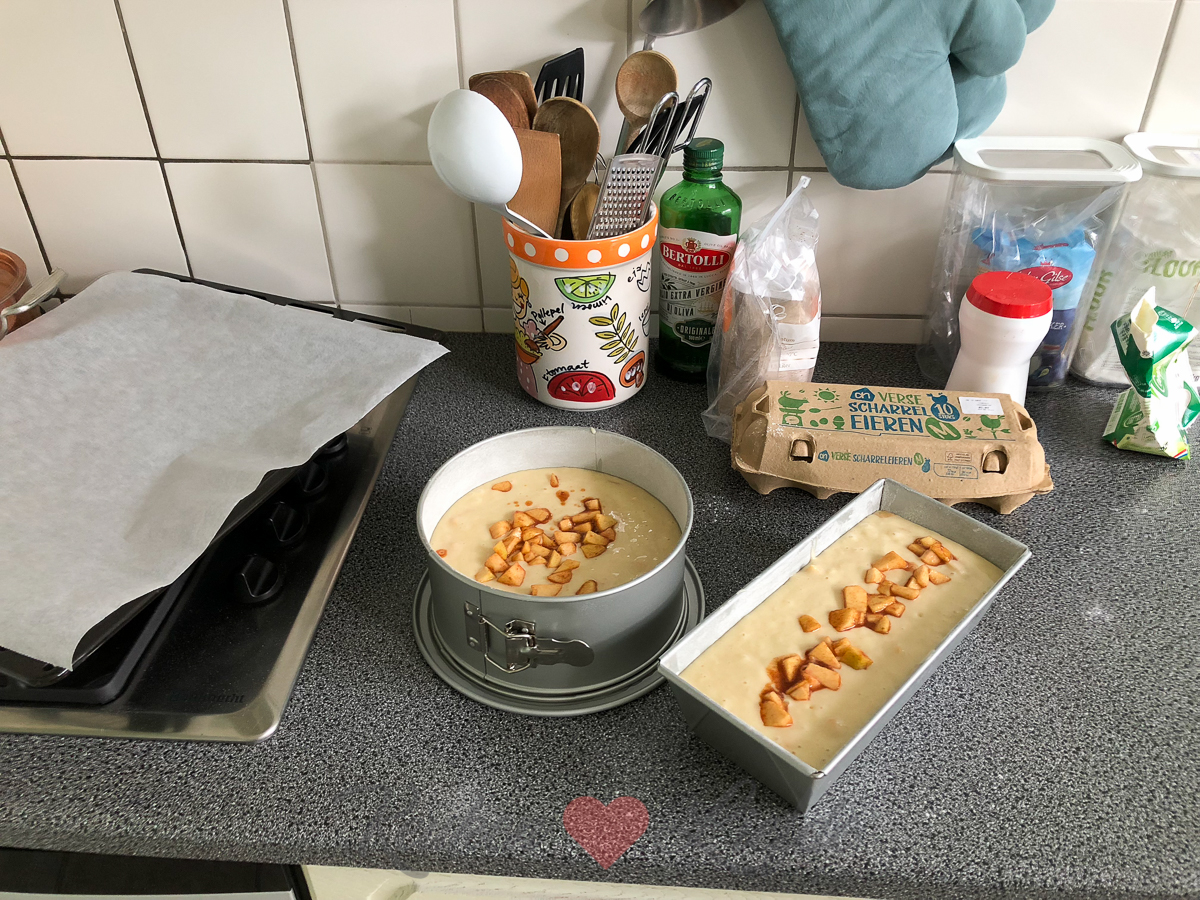 Ik bak ’s ochtends nog twee yoghurtcakes met appel (dezelfde die ik eerder deze week maakte) die ik naar de buren breng. We hadden nog niet echt kennis gemaakt dus hopelijk vallen we hiermee direct in goede aarde… 😉