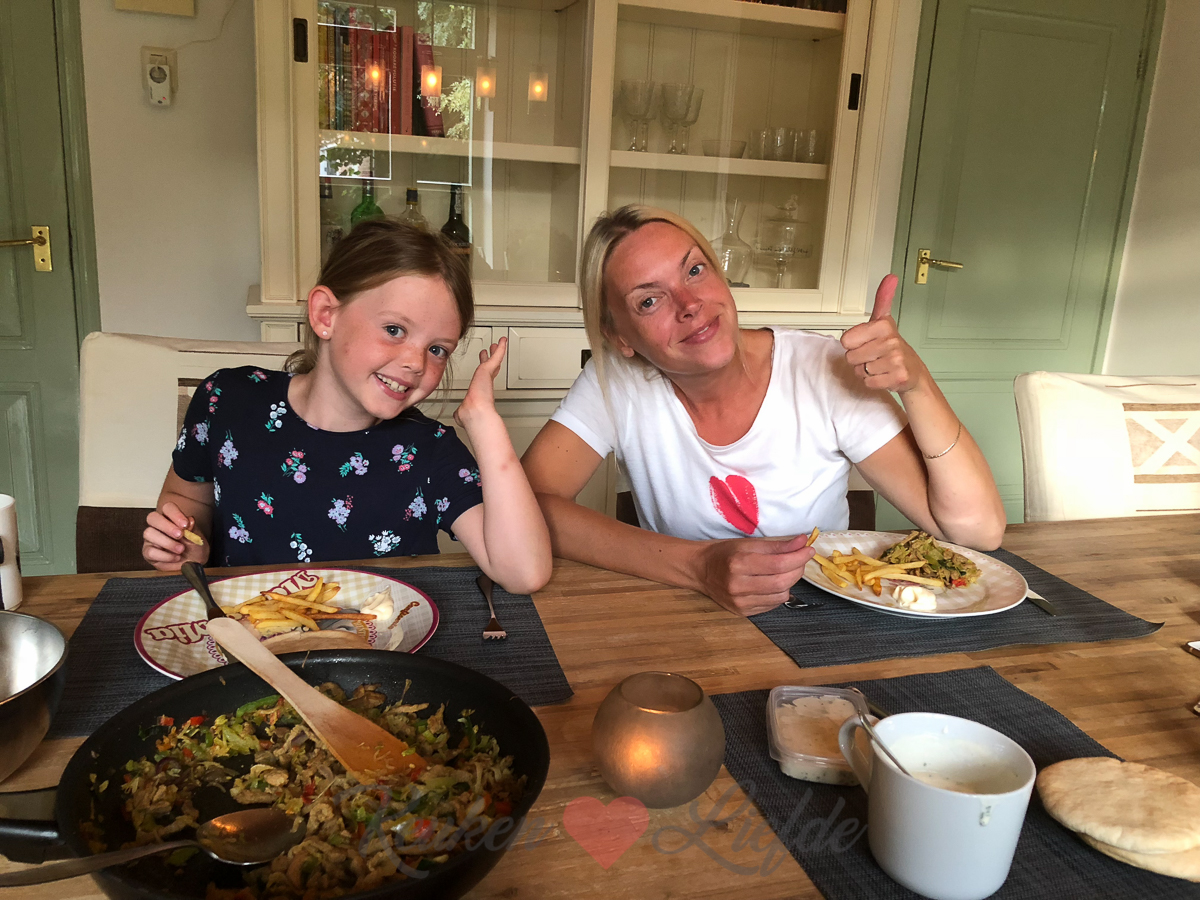 ’s Avonds eten we pitabroodjes met shoarma, zelfgemaakte knoflooksaus en ovenfrietjes.