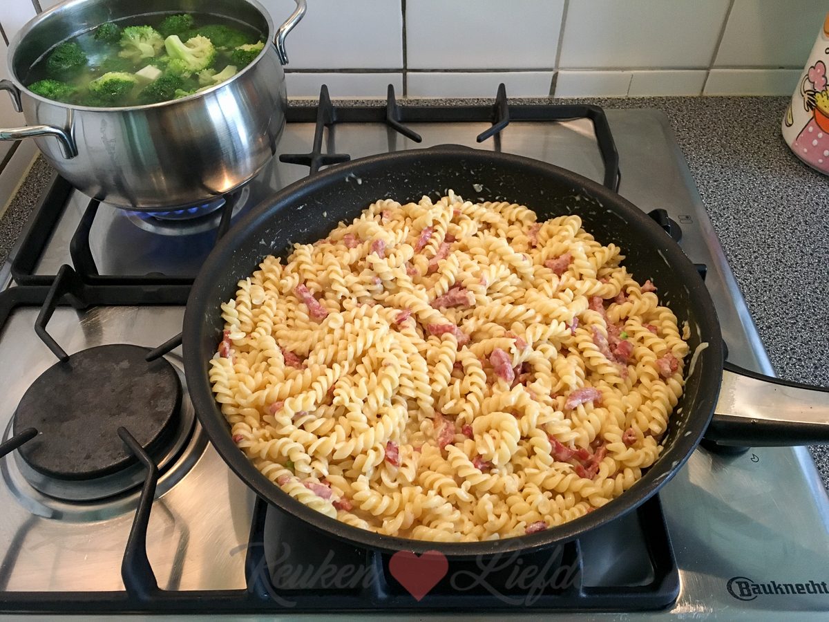 ’s Avonds kook ik pasta met spekjes en broccoli in romige kaassaus. Het is een echte gezinsfavoriet die ik al jaren maak maar het recept staat niet op KeukenLiefde omdat ik een zakje kaassaus en een bouillonblokje gebruik. Omdat er tegenwoordig zo’n taboe heerst op pakjes en zakjes heb ik het recept nooit gedeeld. Hoe je hem maakt? Je kookt de pasta (ca. 300 gram) en een kleine – in roosjes gesneden – broccoli beetgaar. (Dit kan in dezelfde pan, maar houd rekening met verschillende bereidingstijden.) In een koekenpan bak je een uitje en baconreepjes uit. Dan verkruimel je een kippenbouillontablet over de ui en bacon en voeg je de inhoud van het zakje kaassaus en koud water (zoveel als staat aangegeven op het pak kaassaus) toe. Goed doorroeren met een garde tot het bouillonblokje is opgelost en de saus iets dikker wordt. Dan roer je nog 125 gram crème fraîche door de saus en warm even door. Pasta en broccoli afgieten en door de saus roeren. Dit recept is voor circa 3 personen. Eet smakelijk!