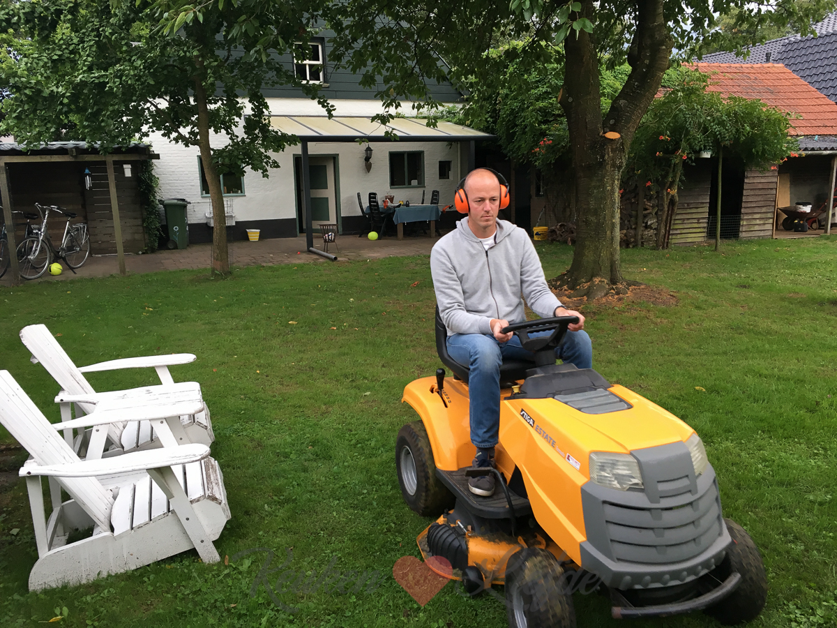 Johan heeft de zitmaaier toch weer aan de praat gekregen dus maait ’s avonds weer een rondje.