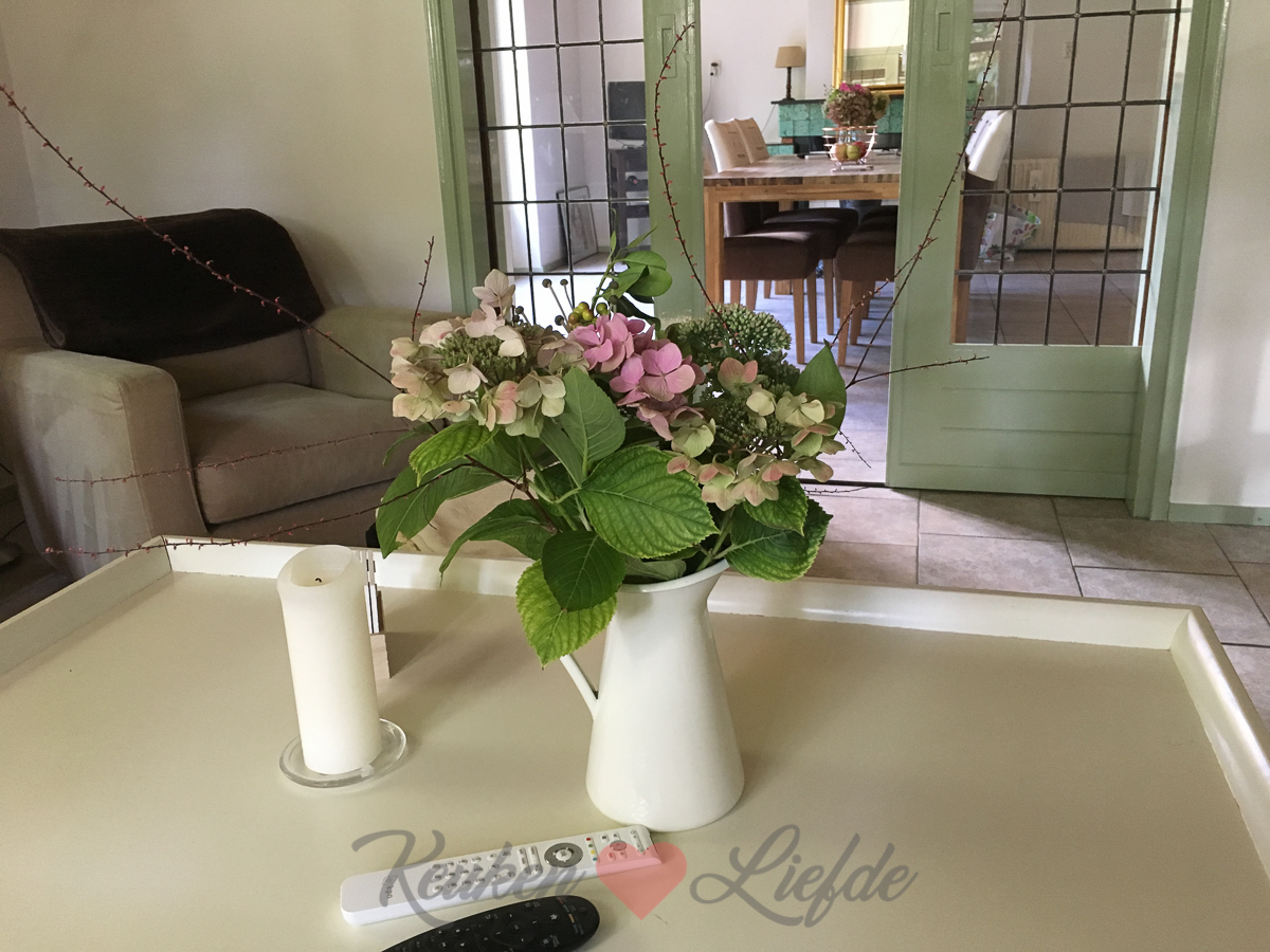 Johan en Ella-Marie zijn ’s ochtends al vroeg weg want Ella heeft een voetbaltoernooi met haar team. Ik rommel thuis een beetje aan en maak boeketjes bloemen voor in huis met bloemen uit onze voortuin.