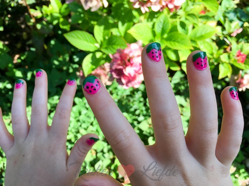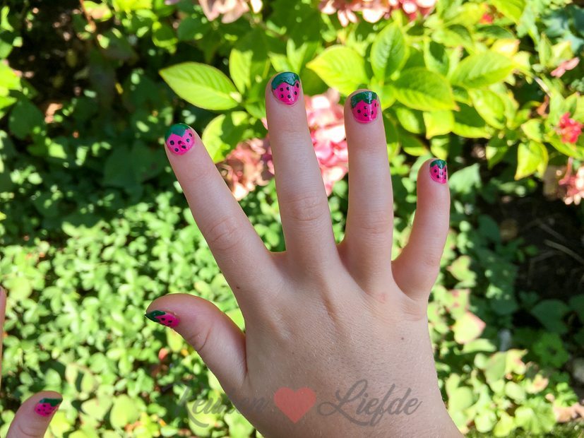 Daarna is het mama-dochter-tijd. Op verzoek van dochterlief lak ik haar nagels in aardbeienmotief. Wat vind je van het resultaat? Ik word er blij van!
