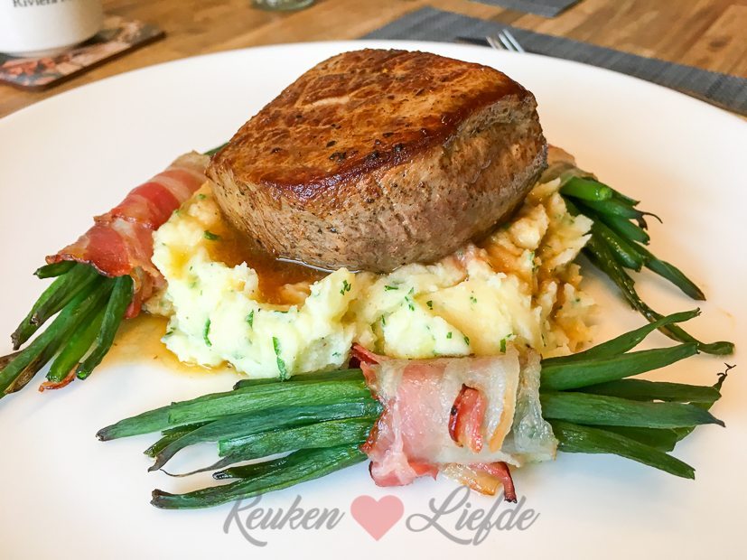 ’s Avonds thuis eten we gebakken biefstuk met jus, aardappelpuree en haricots verts met spek. Feestje!