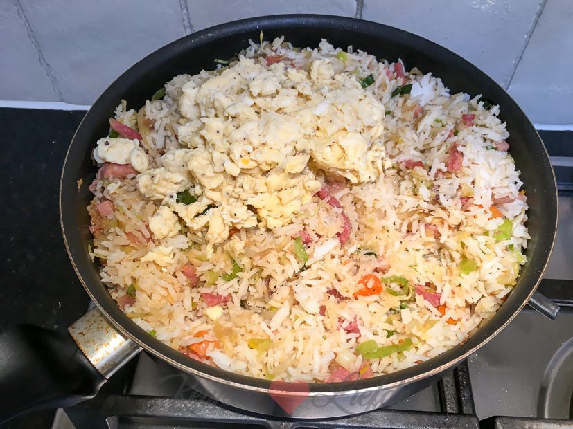 - uitje, knoflook, ham- en spekblokjes, een theelepel sambal en een verkruimelde kippenbouillontablet bakken