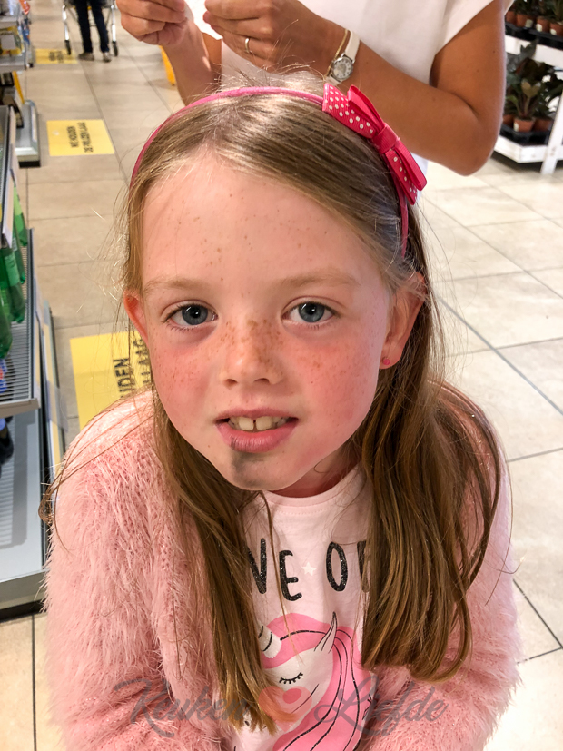 Op woensdag is Ella-Marie om kwart over twaalf uit school en gaan we samen lunchen. Op verzoek van Ella strijken we neer bij de Hema in Tiel. Ella-Marie neemt een broodje hotdog en een kindercappuccino en ik neem een broodje met roomkaas en een grote-mensen-cappuccino. 🙂