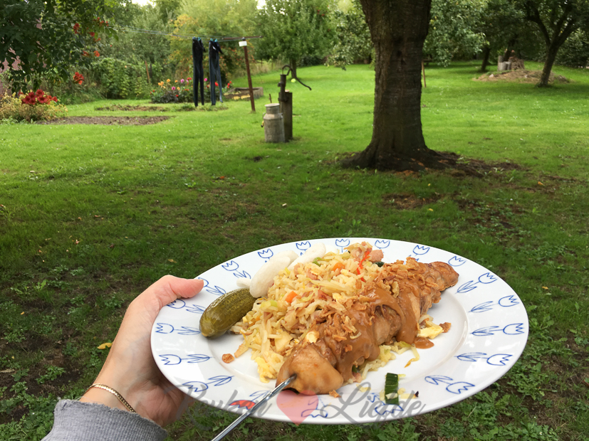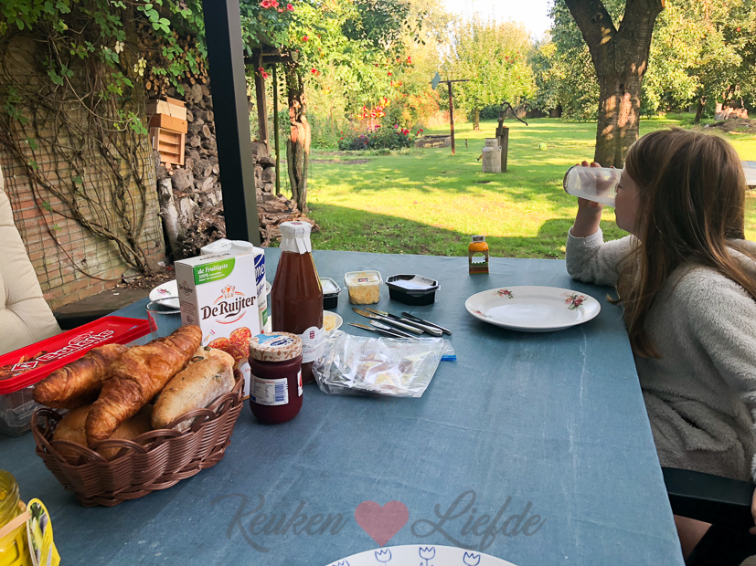 We ontbijten buiten onder de overkapping. We hebben nog bijna niet binnen gegeten in ons nieuwe huis. Dat zal straks wel even wennen zijn als het weer omslaat en de kou ons naarbinnen drijft. Maar voor nu genieten we buiten zolang het kan!