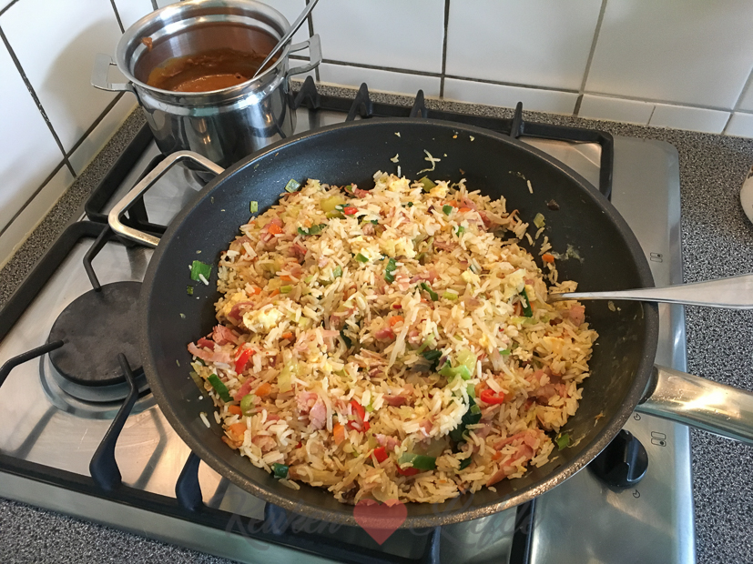 Voor het avondeten maak ik een grote pan met nasi goreng en kipsaté. We zijn er allemaal dol op en we kunnen er altijd twee dagen van eten wat weer makkelijk is voor mij.