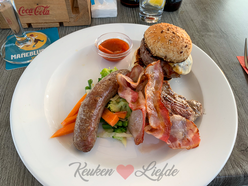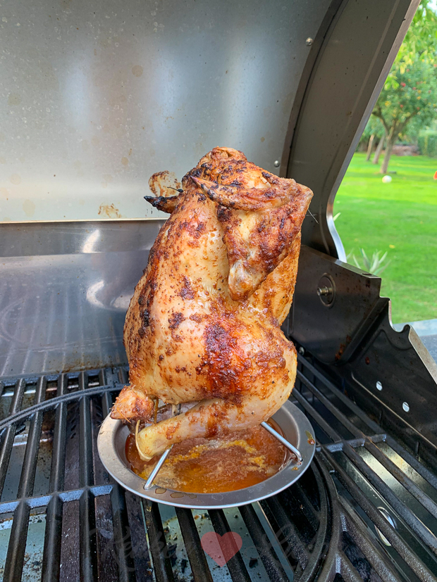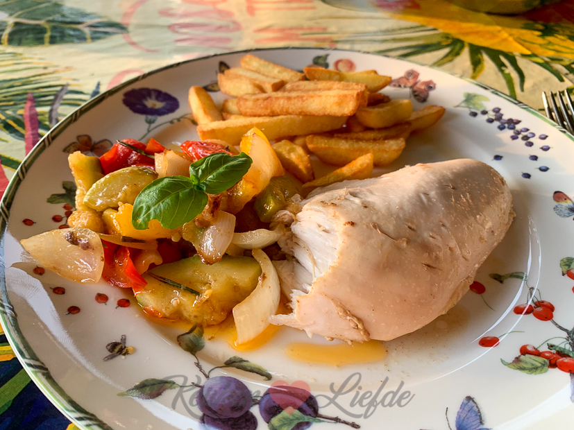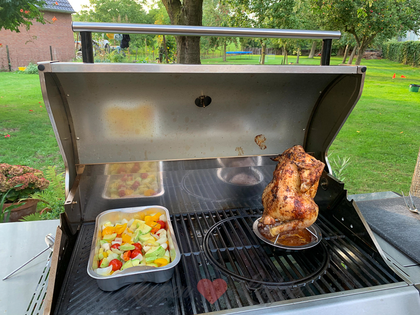 ’s Avonds steken we de barbecue nog eens aan. Erop gaat een hele kip en een schaal vol groenten. Erbij wat frietjes uit de Airfryer en klaar is onze smulmaaltijd.