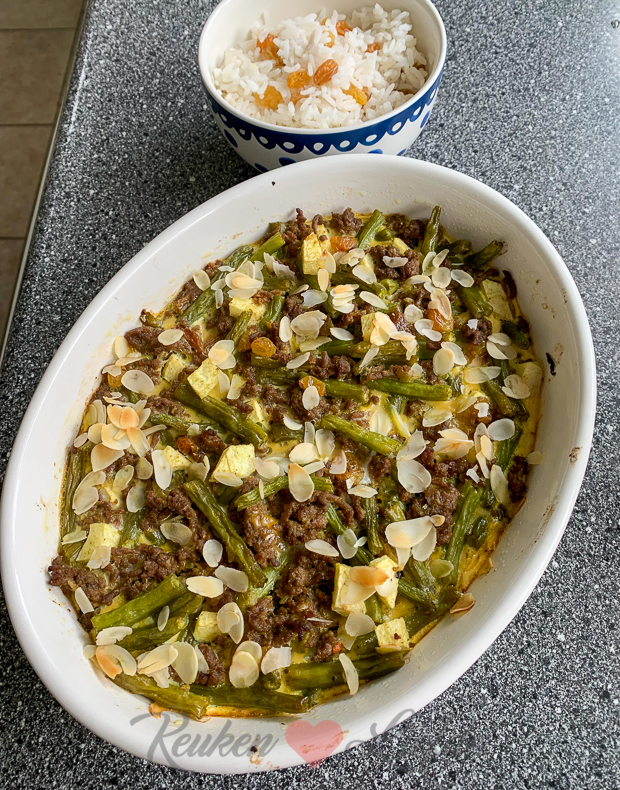 Ik sta in de keuken om twee nieuwe KL-recepten te maken waaronder deze heerlijke bobotie met sperziebonen. Recept komt eraan!