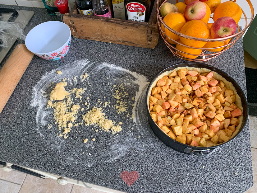 Onze buren komen vanavond op visite en omdat ik graag iets lekkers bij de koffie serveer maak ik een appeltaart. Met appels uit eigen tuin natuurlijk! Ik heb dan altijd het idee dat de taart nóg lekkerder smaakt. Onzin natuurlijk, dat is de beleving.
