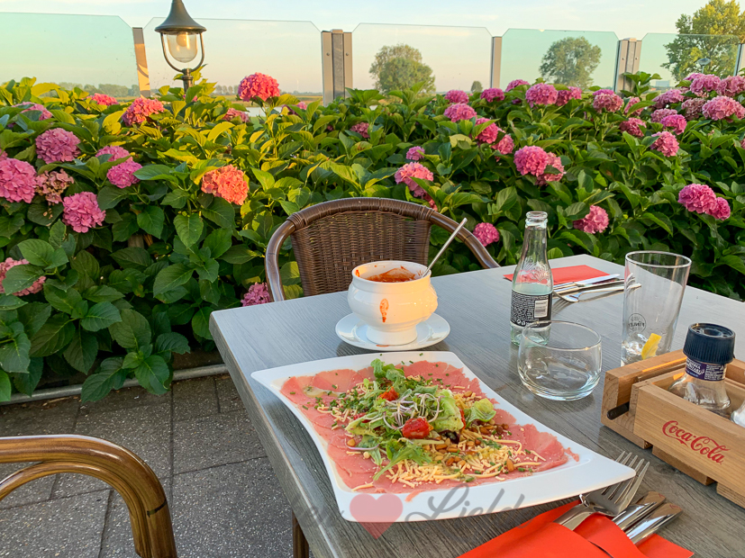 Na een heerlijke middag op het water sluiten we de dag af met een etentje bij Eeterij de Pont in Maasbommel. Dankzij het mooie weer kunnen we lekker buiten op het terras eten.
