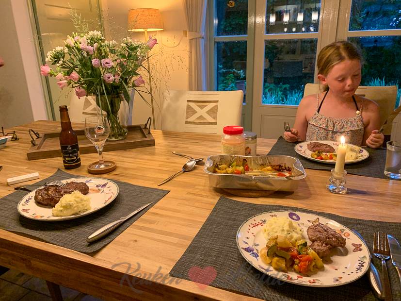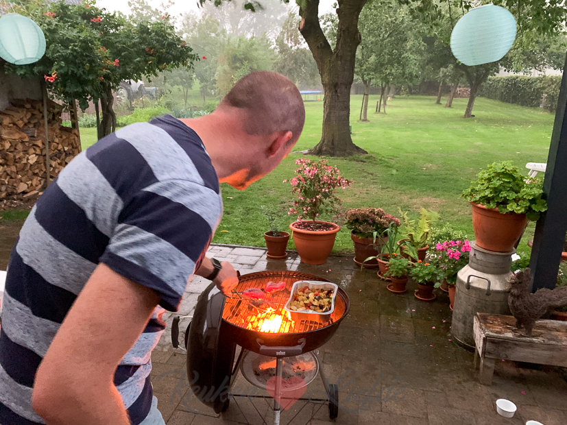 Het is wederom een prachtige zomerdag. Ella-Marie heeft een voetbalwedstrijd en terwijl Johan en Ella op het voetbalveld zijn werk ik nog wat achter de computer en maak het huis aan kant. ’s Middags doen we boodschappen en we rijden langs de slager om biefstuk (voor Ella en mij) en entrecote (voor Johan) te halen voor het avondeten. ’s Middags gaat Ella-Marie nog even naar het zwembad en Johan en ik rommelen in de tuin. Rond een uurtje of zes steekt Johan de barbecue aan. Net als hij de schaal met groenten en het vlees op de barbecue heeft liggen, verandert het weer. De stapelwolkjes zijn veranderd in donderwolken en de wind steekt op. Terwijl ik binnen de aardappelpuree sta te maken, breken buiten de hemelsluizen open. Johan kan nog net op tijd de barbecue onder de overkapping rijden en doet een schietgebedje dat het vuur niet uitwaait.