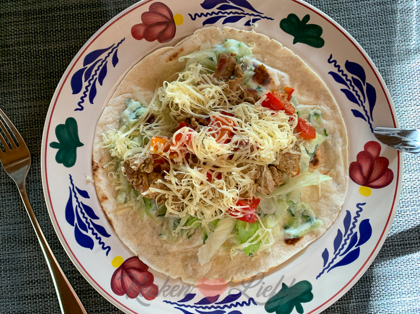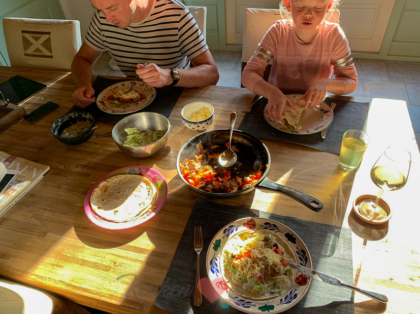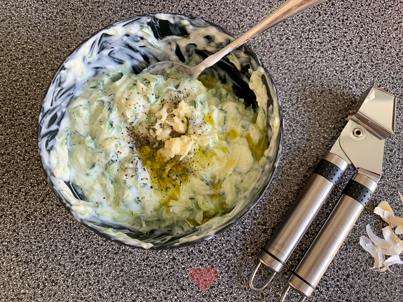 Als de keuken weer is opgeruimd maak ik tzatziki en zet ik vlees in de marinade voor het avondeten. ’s Avonds eten we wraps met zelfgemaakte gyros en tzatziki.
