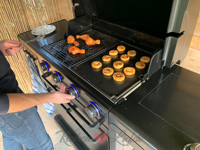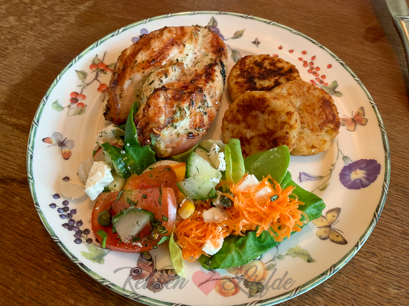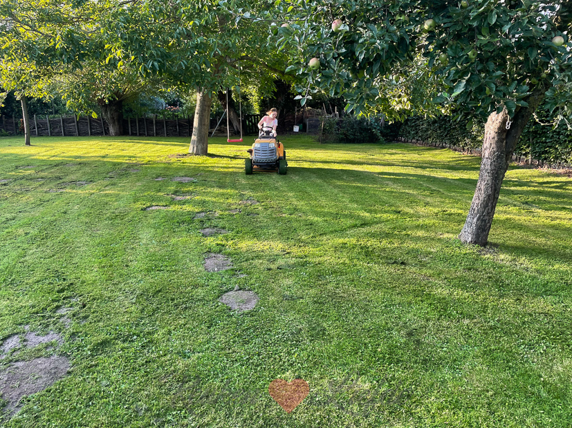 Ook vandaag is het weer lekker zomerweer. Ik plan mezelf ’s middags vrij en samen met El chillen we in de tuin. Beetje zwemmen, boekje lezen in de hangmat, we vermaken ons prima. ’s Avonds steken we de barbecue weer aan. Op het menu staan gemarineerde kippenpoten (voor Johan en Ella) en kipfilet (voor mij) van de poelier met röstirondjes en een salade. Na het eten wil Johan het gras nog even maaien en Ella roept meteen of zij dat mag doen. Wel ja, waarom niet. Ze deed het keurig!