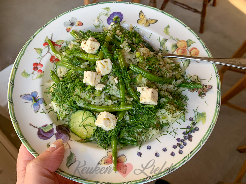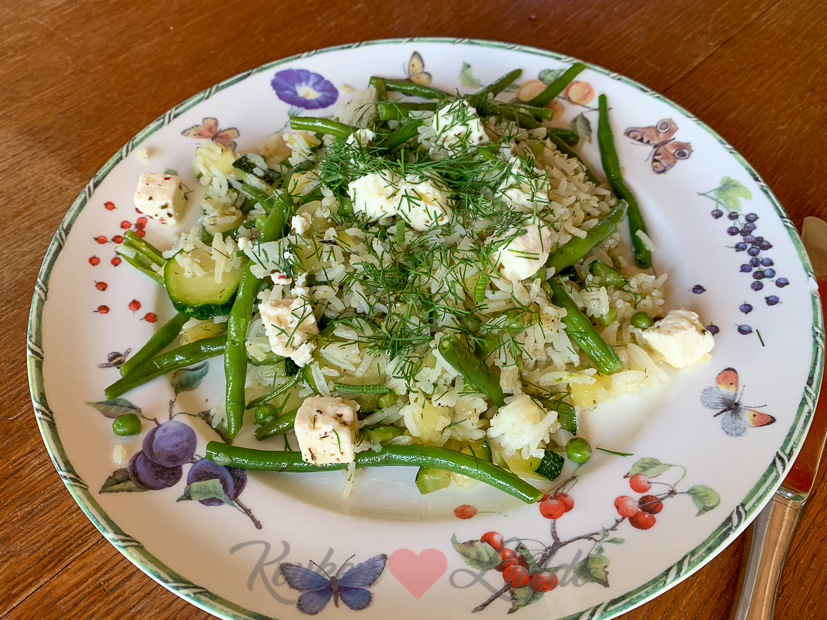 Voor het avondeten bak ik wat gekookte rijst op die nog in de koelkast staat. Ik fruit eerst een uitje aan met wat knoflook, verkruimeld kippenbouillontablet erbij, rijst erbij, doperwten en sperziebonen uit de diepvries erbij en wat courgette bak ik mee. Even lekker opbakken tot alles gaar en door en door warm is. Dan afmaken met veel verse dille en feta. Was erg lekker!