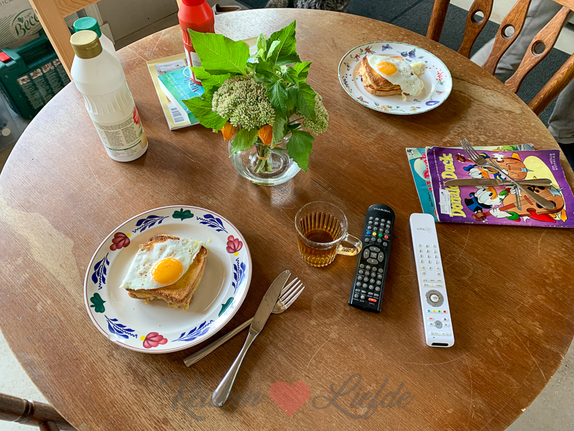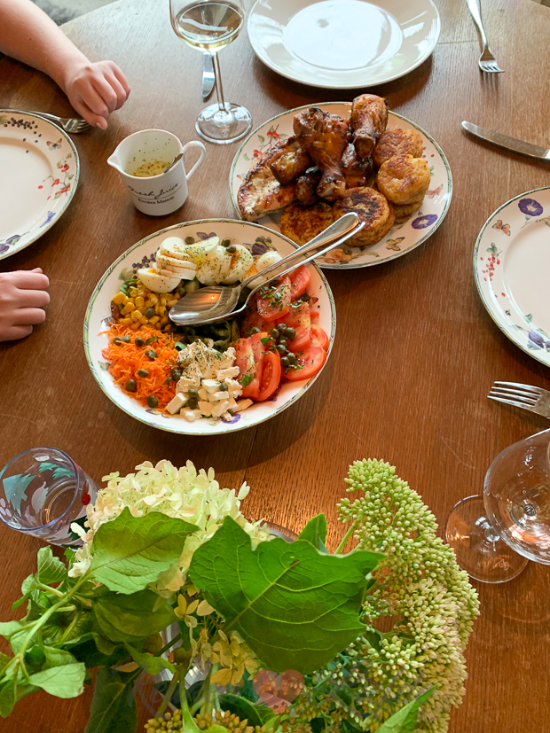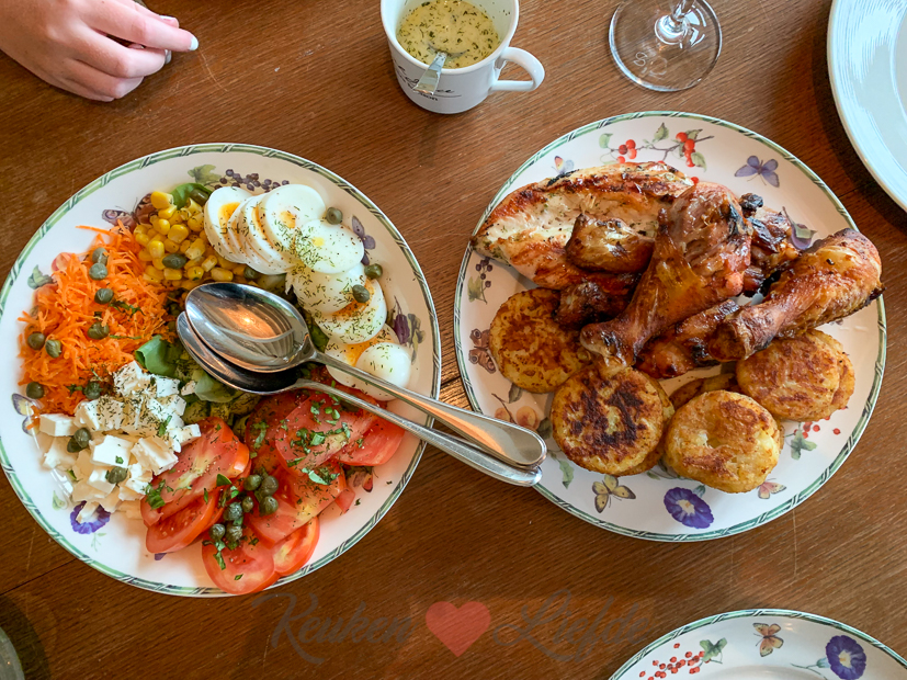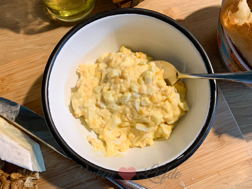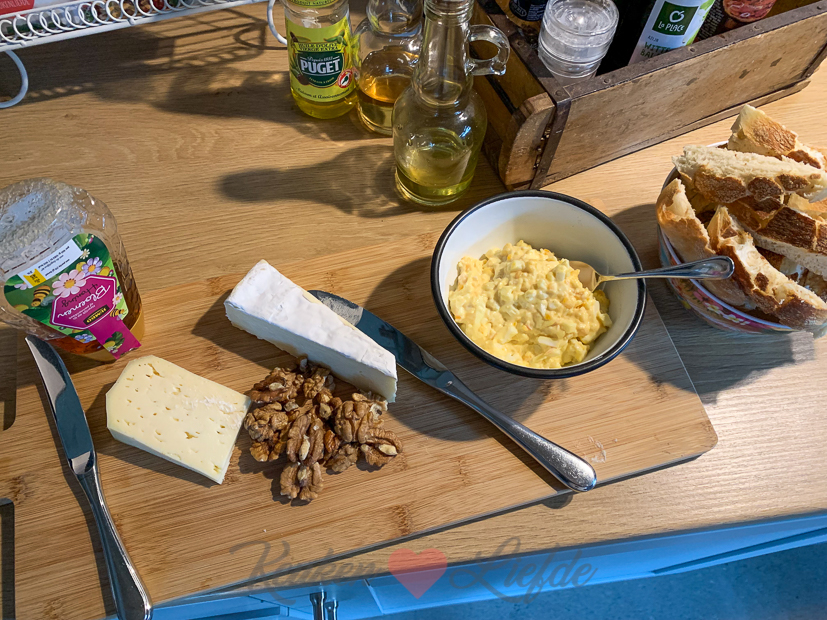 Omdat we ’s avonds niet zoveel honger hebben slaan we het avondeten over en maken wat later op de avond een klein borrelplankje. We smikkelen het op terwijl we tv kijken. Johan maakt zijn befaamde eiersalade erbij. Heel simpel met wat fijngesneden gerookte kipfilet, een druppeltje maggie, een snufje kerrie en mayonaise. Verslavend lekker.
