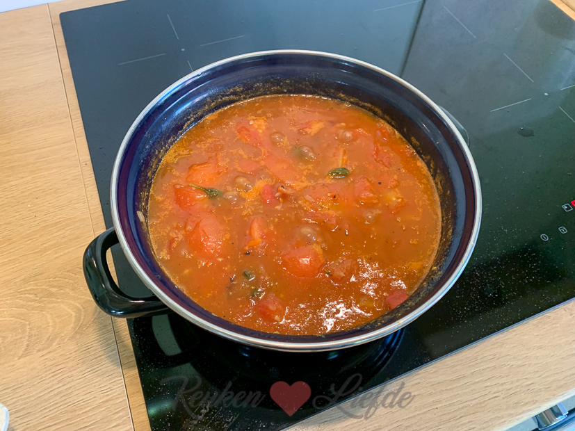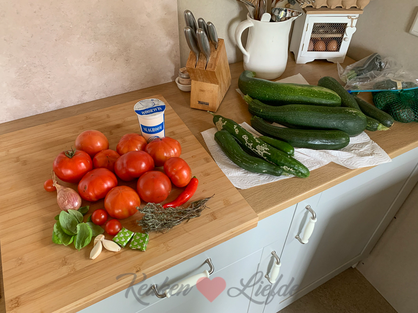 Omdat ik flink wat tomaten heb geplukt in de moestuin besluit ik ’s ochtends alvast een pan verse tomatensoep te maken voor het avondeten. Voordat ik aan de slag ga leg ik alle ingrediënten vast klaar. Ernaast op het aanrecht liggen nog courgettes uit de moestuin, daar moet ik nog even een receptje voor bedenken binnenkort…