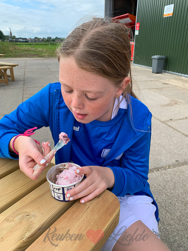 Als Ella eind van de middag weer thuis is gaan we samen even een ijsje halen. Een boerenbedrijf net buiten het dorp maakt en verkoopt sinds kort vers boerderij-ijs en dat moeten we natuurlijk proeven. De ijsco-kar staat in de koeienschuur waar de koeien gezellig staan te keuvelen. We nemen elk twee bolletjes. Genieten!
