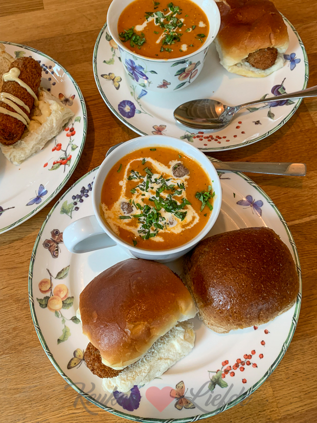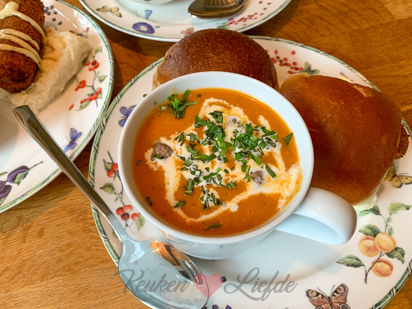 Voor het avondeten hoef ik alleen de tomatensoep op te warmen. We bakken er nog wat kroketten bij in de oven, voor een bolletje kroket. Prima zaterdagavondmaaltje!