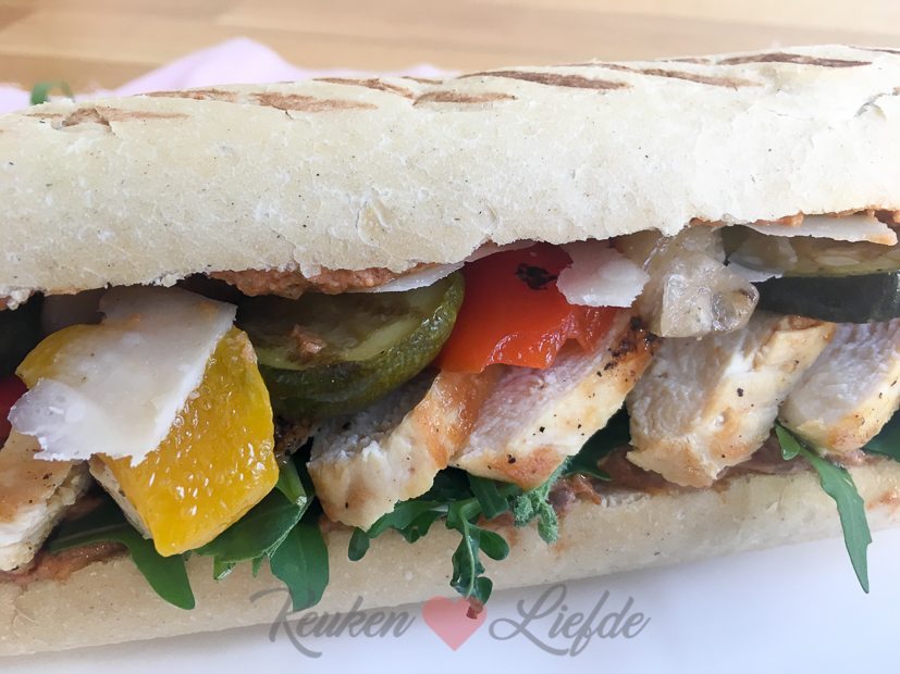 Voor de lunch pak ik lekker uit en verwen mezelf met een panini met kip, pesto en gegrilde groenten.