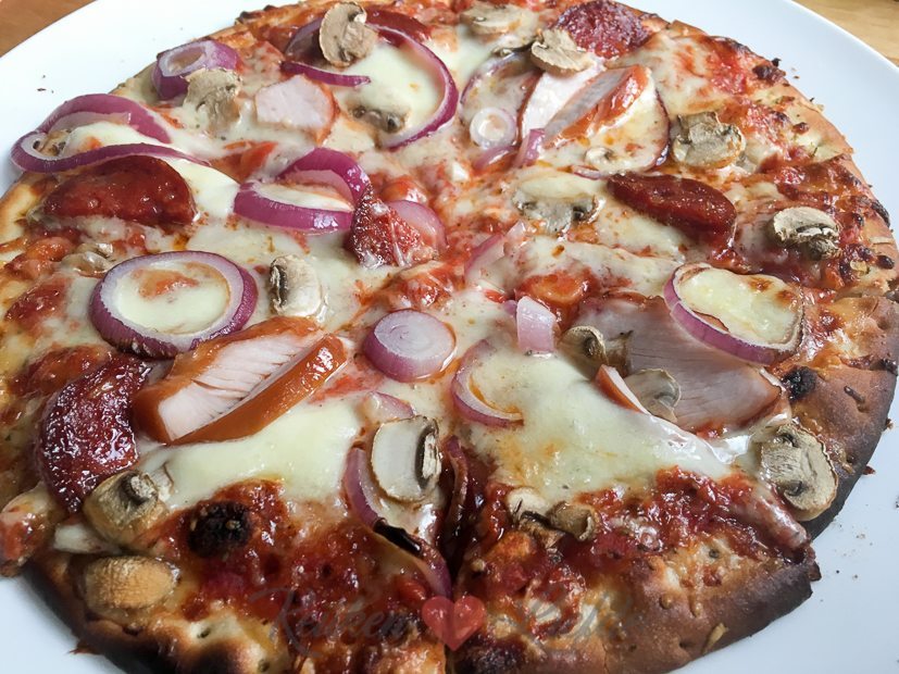 - Een diepvries margherita extra belegd met gerookte kip, mozzarella, rode ui, ham en champignons