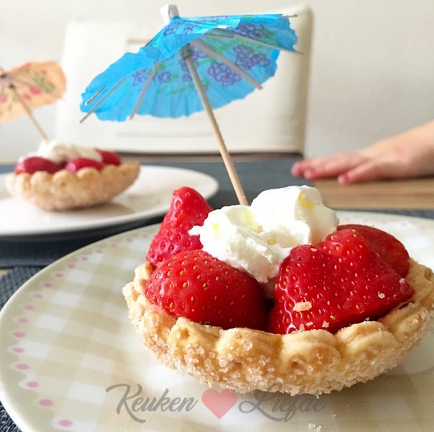 Ik kook verse tagliatelle met ham en paddestoelenroomsaus en Ella-Marie verzorgt het toetje. Een gesuikerde bladerdeegschelp met aardbeien en slagroom. En een vrolijk parapluutje. 🙂