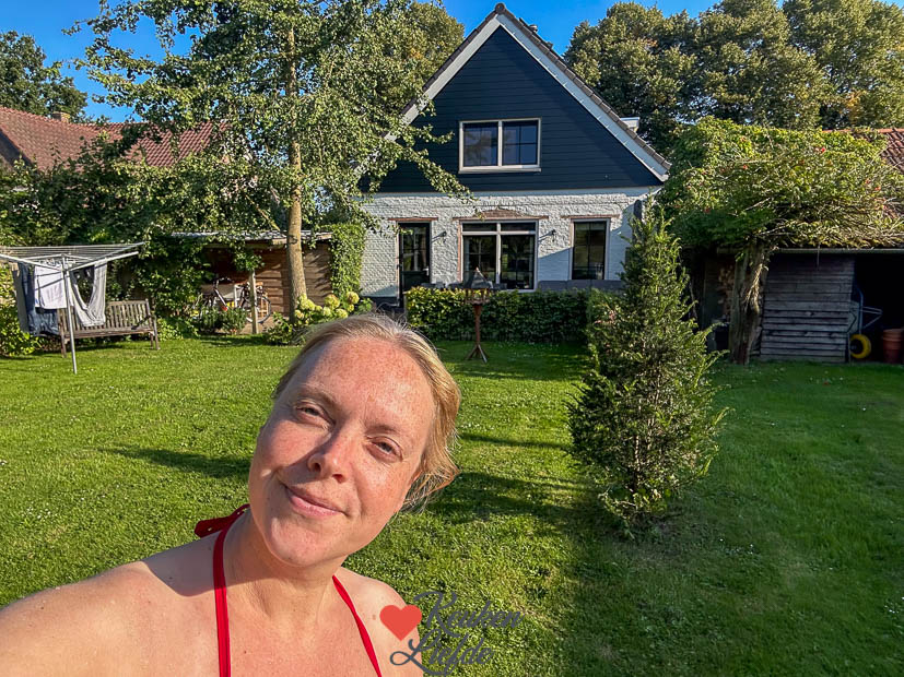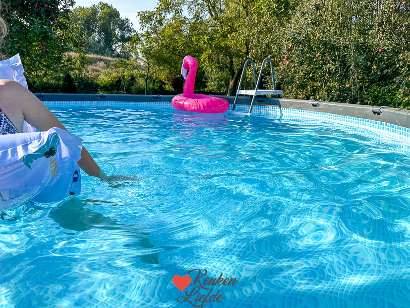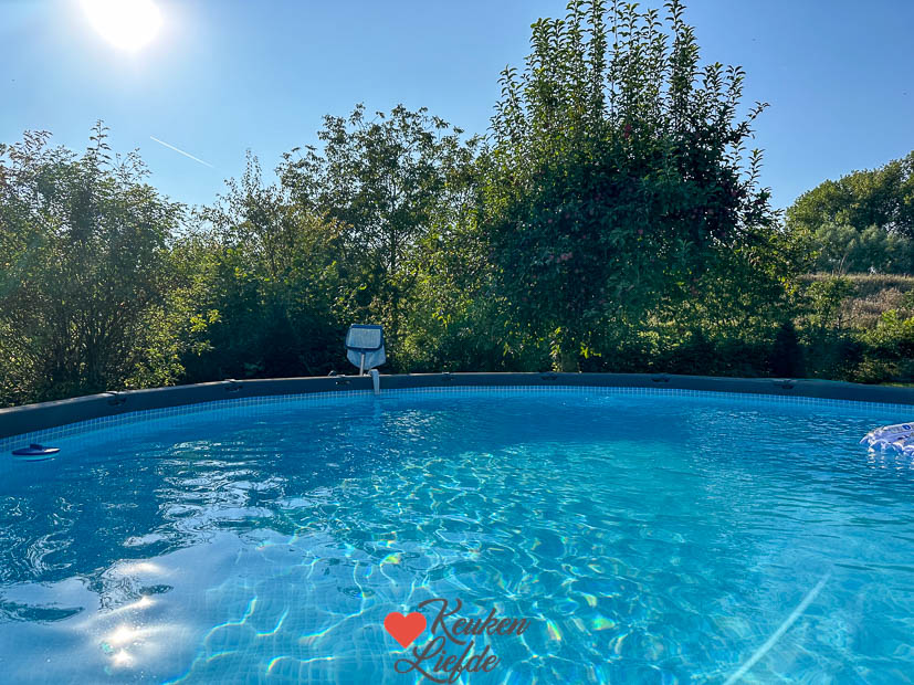 Het najaar zit ook al duidelijk in de lucht want de appelbomen hangen bomvol. Dat wordt appeltaart maken binnenkort. 😋 Elke dag haal ik de stofzuiger even door het zwembad zodat hij schoon blijft. Ik heb zelf nog nooit zoveel gezwommen als dit jaar. Heerlijk om na een dag binnen op kantoor zitten of in de keuken te zweten, even af te koelen in het zwembad. 💦
