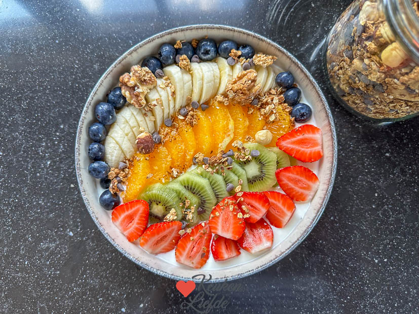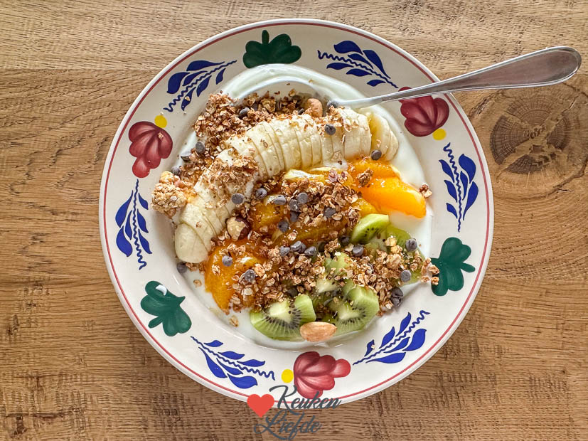 De granola vliegt er doorheen want ook Ella-Marie en Johan eten hem graag met yoghurt als ontbijt. Het is het ideale ontbijt als je weinig tijd hebt. Maar met vers fruit erbij is hij helemaal af. Na zo’n bordje ben ik de verzadigd tot het avondeten.