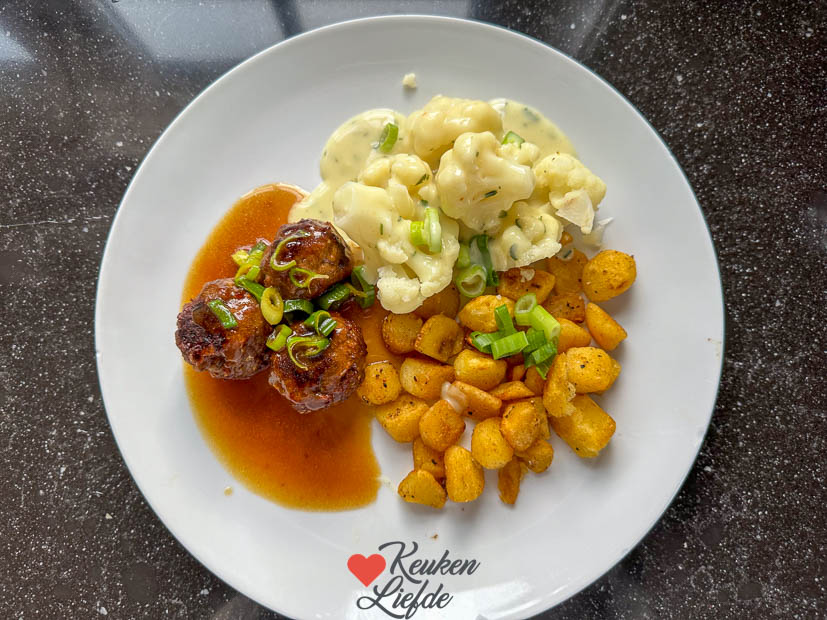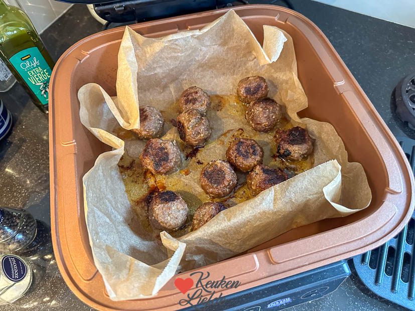 ’s Avonds maak ik weer eens een Hollands agv’tje voor het avondeten. De gehaktballetjes maken we tegenwoordig in de multicooker op de airfrystand. Ik leg ze op een bakpapiertje in de bakvorm en gebruik geen boter of olie. Ze worden dan goudbruin en krokant vanbuiten en blijven sappig vanbinnen. (We hadden ze nu iets te lang gebakken 🫣 maar ze waren nog steeds heerlijk!)