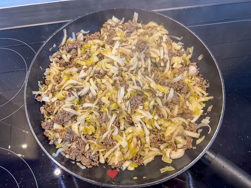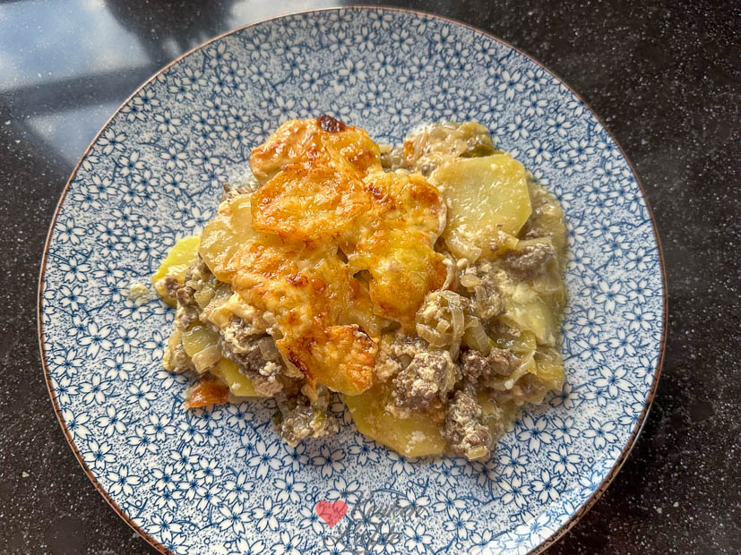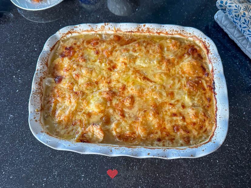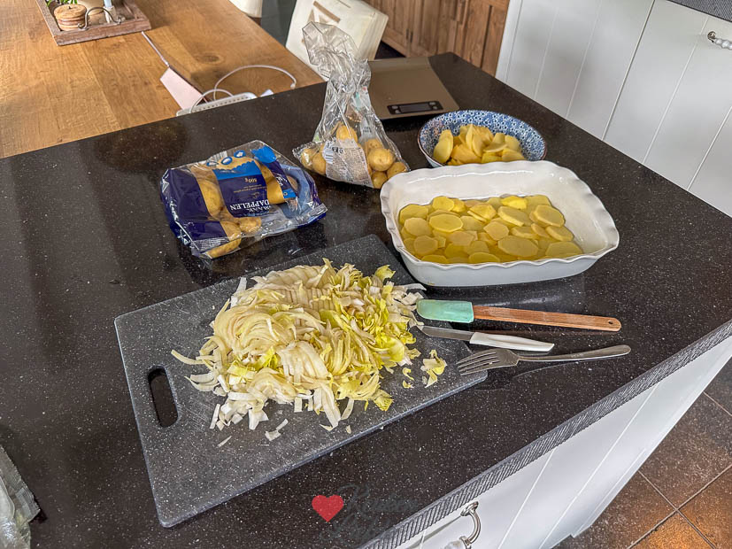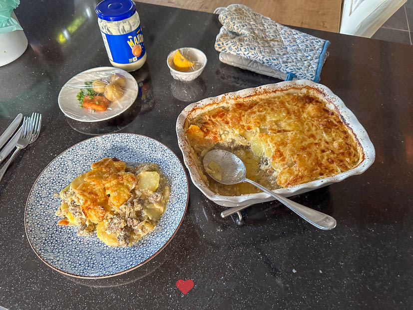 In de supermarkt zag ik witlof liggen en ik wist meteen: dat wordt avondeten. Ik maakte de witlof-ovenschotel van KeukenLiefde met gehakt, aardappelschijfjes en roomsaus — ’s avonds kon hij zo de oven in. Ella-Marie is niet dol op ovenschotels, dus zij kreeg een AVG’tje met Iglo-kibbeling die ik laatst opgestuurd kreeg. Ella vond ’m niet zo: vis te droog, korstje te zacht. Ik vond ’m voor diepvrieskibbeling best oké — wel wat aan de zoute kant.
