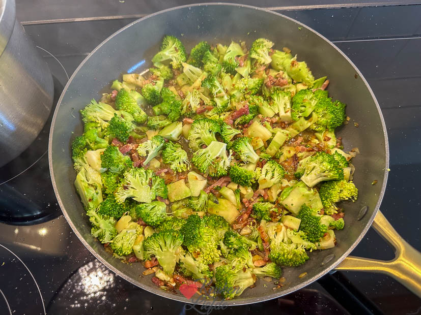 - Voeg broccoli, het bouillonblokje en een scheut water toe. Deksel erop en zachtjes garen tot de broccoli beetgaar is en het vocht bijna weg.