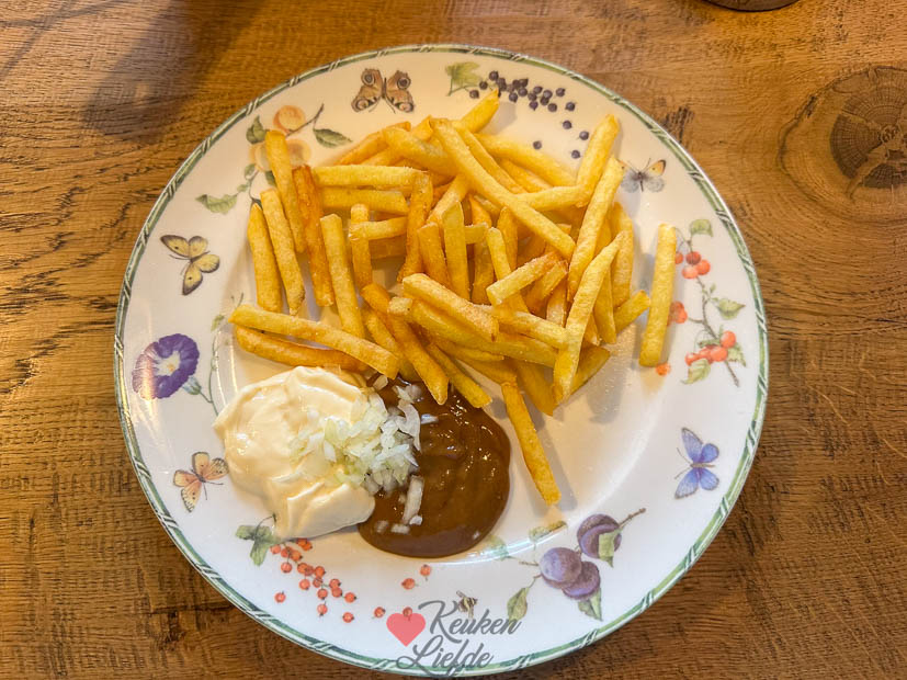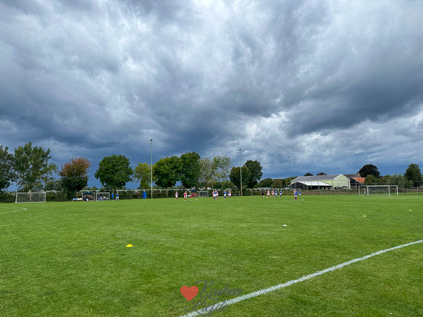 Zaterdagmiddag had Ella-Marie een thuiswedstrijd, dus stonden Johan en ik langs de lijn. 3–1 winst! Donkere wolken hingen boven het veld, maar het bleef gelukkig droog — tot we thuis waren, toen barstte de regen los. Mijn moeder appte een foto van hun avondeten: erwtensoep met roggebrood, mosterd en rookworst. Ik kreeg er meteen trek van, maar bij ons stond friet op tafel. Ik ging voor een frietje oorlog en daarna nog een bamischijf.