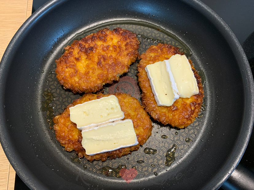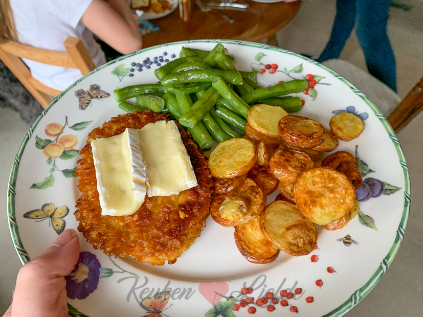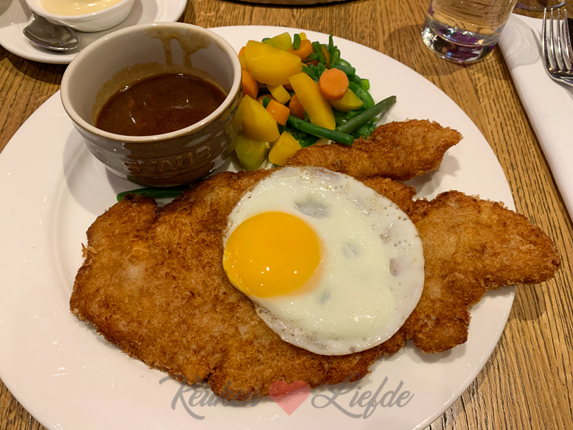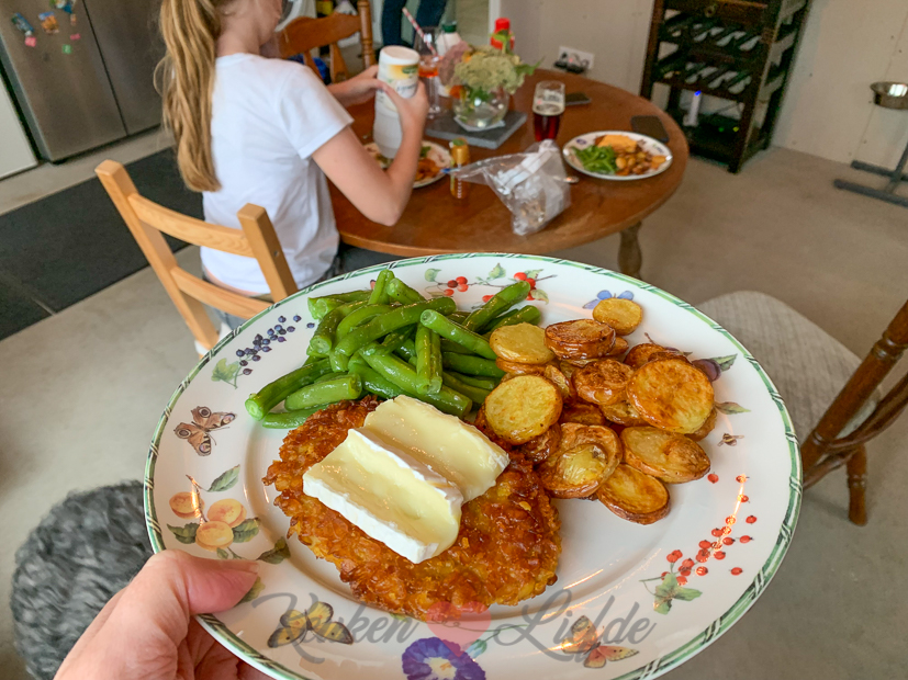 - De kipschnitzel van mij en Ella wordt belegd met brie