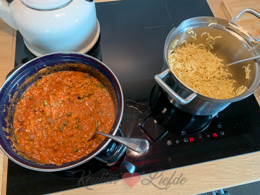 Ella heeft vandaag schoolreisje en gaat naar Toverland! Haar laatste schoolreisje op de basisschool alweer. Als Johan en Ella de deur uit zijn zet ik eerst de bos bloemen in een vaas die we gisteren kregen van Johan zijn ouders voor ons kookboek. Wat een mooie bos! Daarna ga ik aan het werk op kantoor. Ik moet vandaag thuis blijven want de post komt langs om alle postzakken en pakketten op te halen. Tussendoor maak ik alvast een pan bolognesesaus voor het avondeten. Ik maak altijd de bolognesesaus uit dit lasagnerecept en voeg er dit keer nog extra kappertjes en zwarte olijven aan toe. Ik hoef er vanavond alleen nog wat pasta bij te koken. Rond half zes gaan Johan, ik en Nacho naar school om de bus op te wachten. Ze hadden een topdag gehad!