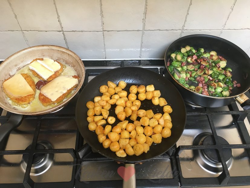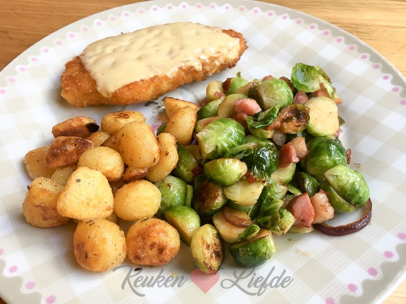 Samen met Ella-Marie ga ik ’s middags boodschappen doen. Ella mag bepalen wat we eten vanavond en als ze bij binnenkomst spruiten ziet liggen hoeft ze niet meer na te denken. De spruiten kook ik niet, maar snijd ik doormidden en bak ik samen met spek en rode ui in de koekenpan totdat ze beetgaar zijn. Als de spruiten bijna gaar zijn voeg ik een kneepje honing toe. Verder bak ik krieltjes en kipschnitzels met kaas. Niet een hele slanke maaltijd, maar o zo lekker!