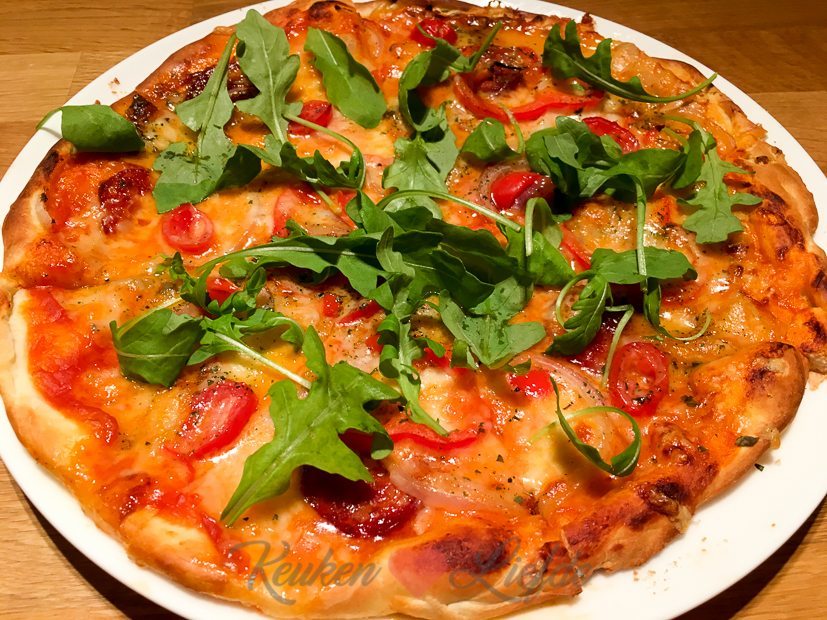 ’s Avonds eten we pizza! Dit keer niet met mijn zelfgemaakte pizzadeeg, maar met een rol vers pizzadeeg van Tante Fanny. Ik had twee rollen gekocht, maar bleek na wat stretching genoeg te hebben aan een rol.