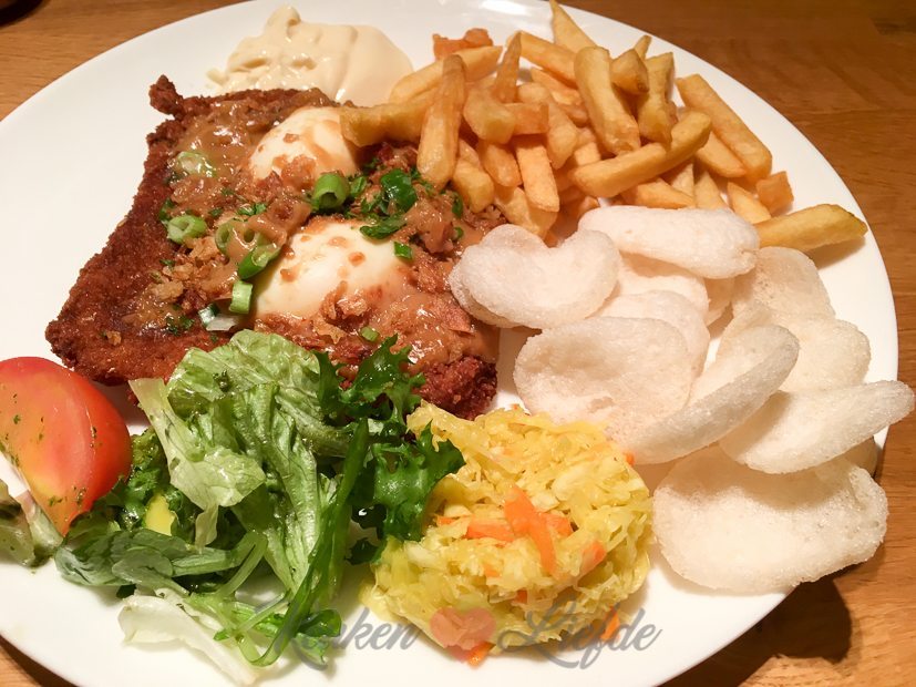 Als El op bed ligt hebben Johan en ik nog steeds geen zin om te koken en laten we een schnitzelmenu thuisbezorgen van de Schnitzel Koning. Johan besteld de Schnitzel Jakarta en ik neem een schnitzel met geitenkaas, honing, pijnboompitten en rucola.