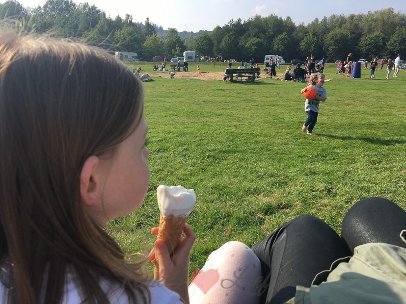 Mijn ouders passen een paar uurtjes op Ella-Marie omdat ik moet werken. Aan het eind van de middag haal ik haar weer op. Terwijl El een herfstbakje bij elkaar sprokkelt klets ik even bij met moeders.