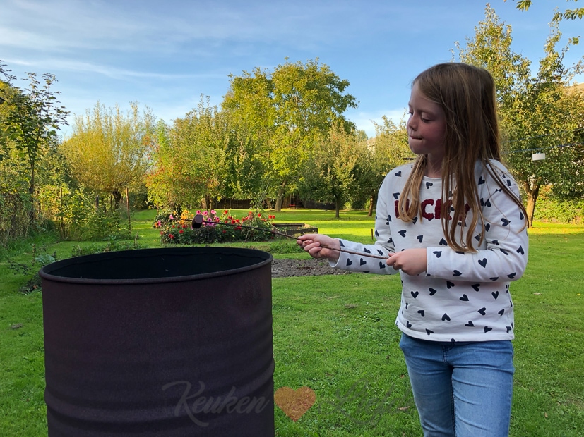 Als we terugkomen heeft Johan de vuurton aangestoken en roosteren we marshmallows boven het vuur.