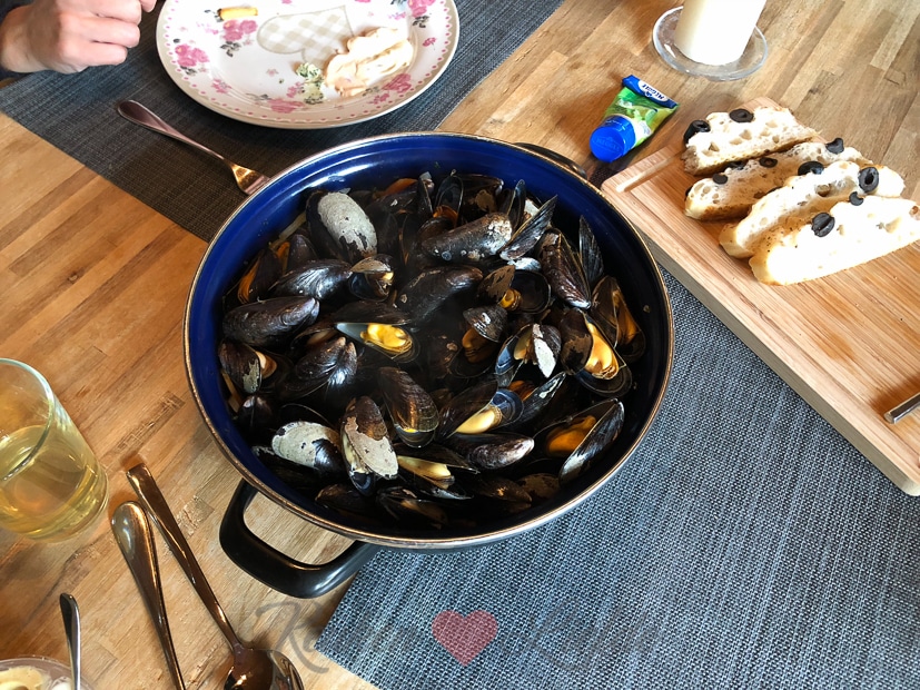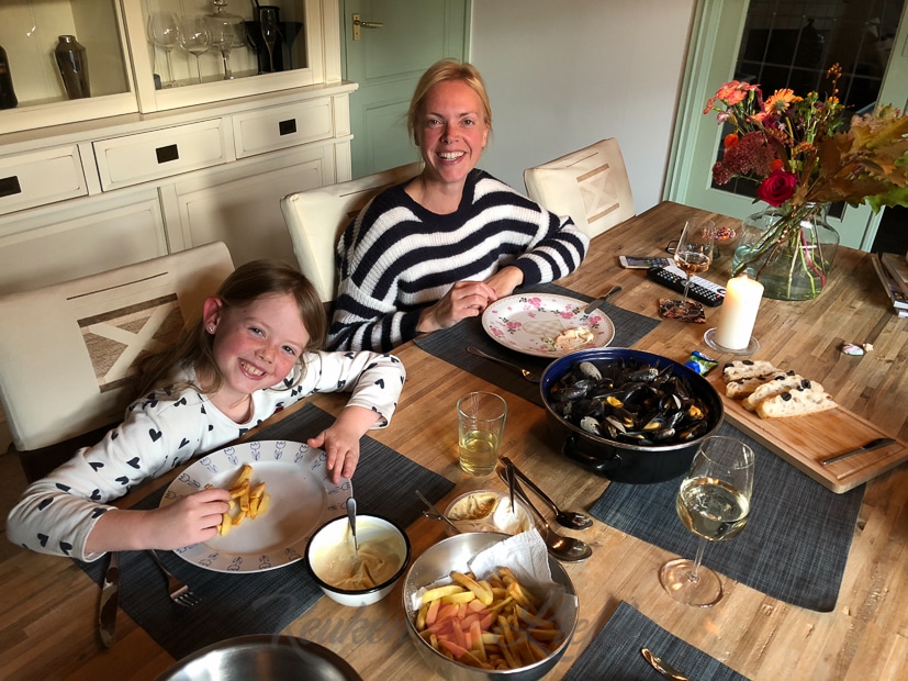 Als de zon ondergaat en het buiten frisser wordt gaan we naar binnen om mosselen te eten.