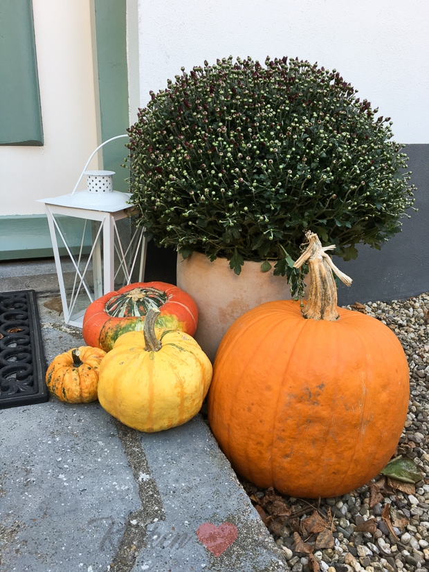 Ik kleed de entree bij onze voordeur wat herfstiger aan met mooie potten met bolcrysanten en pompoenen. Dat ziet er gezellig uit toch!