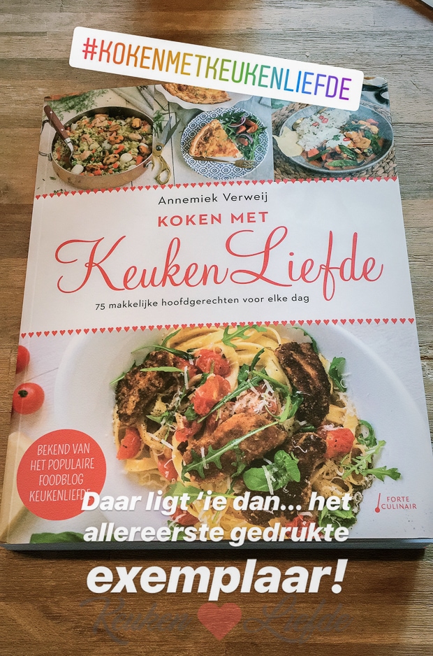 Mijn dag kan niet meer stuk want ons kookboek ligt in de brievenbus! Het allereerste gedrukte exemplaar van KOKEN MET KEUKENLIEFDE eindelijk in handen. Wat is dat een bijzonder gevoel. We zijn erg blij en trots op het resultaat en ik kan niet wachten om te horen wat jullie ervan vinden. KOKEN MET KEUKENLIEFDE – een kookboek met 75 heerlijke hoofdgerechten (kip, vis, vlees en vega) voor elke dag – ligt omstreeks 17 oktober in de boekhandels maar je kunt hem hier alvast reserveren! Dan valt hij straks automatisch bij jou op de deurmat en ben je verzekerd van een exemplaar!