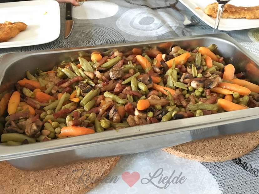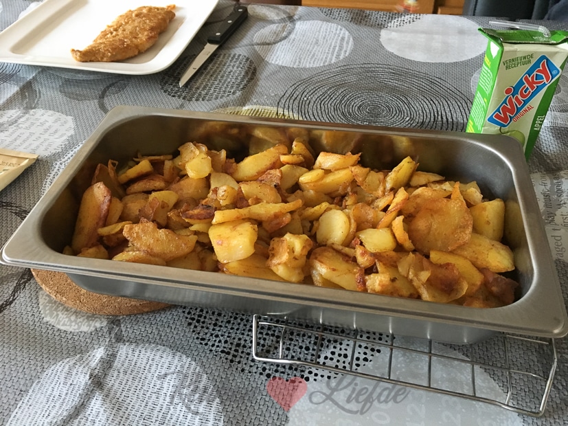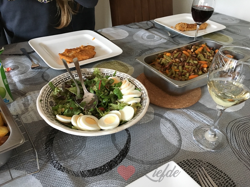 Johan zijn moeder is vandaag jarig en we schuiven aan voor het avondeten. Op tafel komen gebakken aardappels, bonne femme, schnitzels en sla. Smullen!