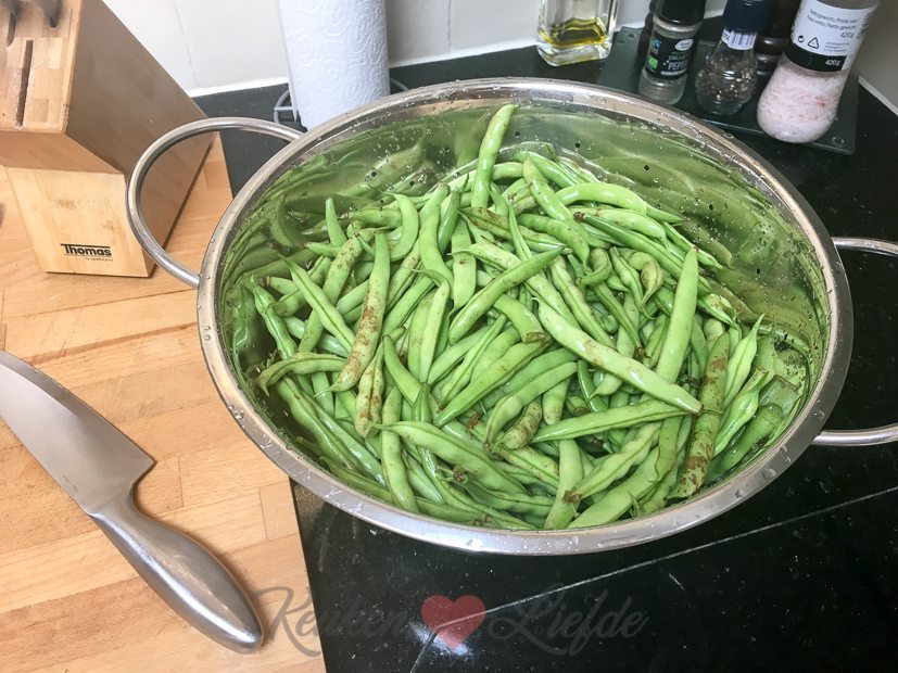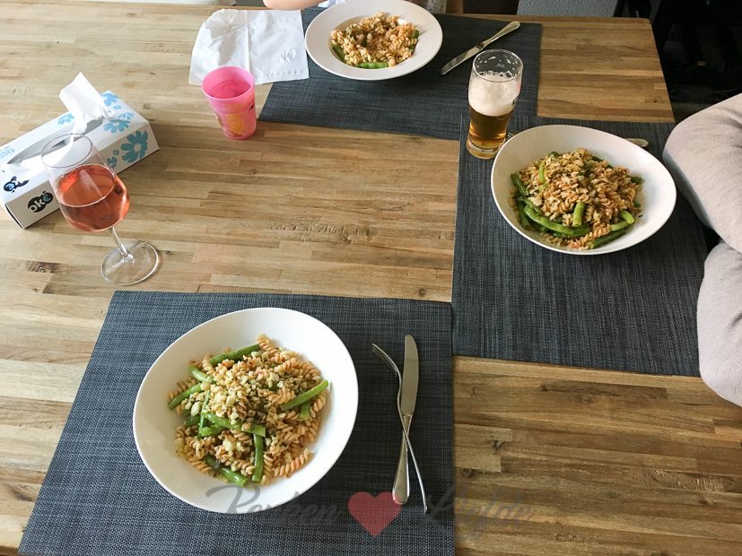 We hebben weer een zak vol sperziebonen gekregen van Johan zijn oma. Heerlijk! Ik maak een pasta pesto met de gegrilde groente pesto van Saclà (die is zó lekker!), sperziebonen en krokant knoflook-broodkruim als topping. Voor 2 à 3 personen: 200 g pasta en 200 g sperziebonen in dezelfde pan tegelijk beetgaar koken. Afgieten en kopje kookvocht opvangen. Terug in de pan met wat kookvocht, inhoud potje pesto, wat olijfolie en op smaak brengen met zout en peper. Bestrooien met krokant broodkruim: 2 sneetjes (oud) witbrood, 1 teen knoflook en takjes peterselie in hakmolen fijnmalen en met olijfolie in koekenpan goudbruin bakken. Eet smakelijk!