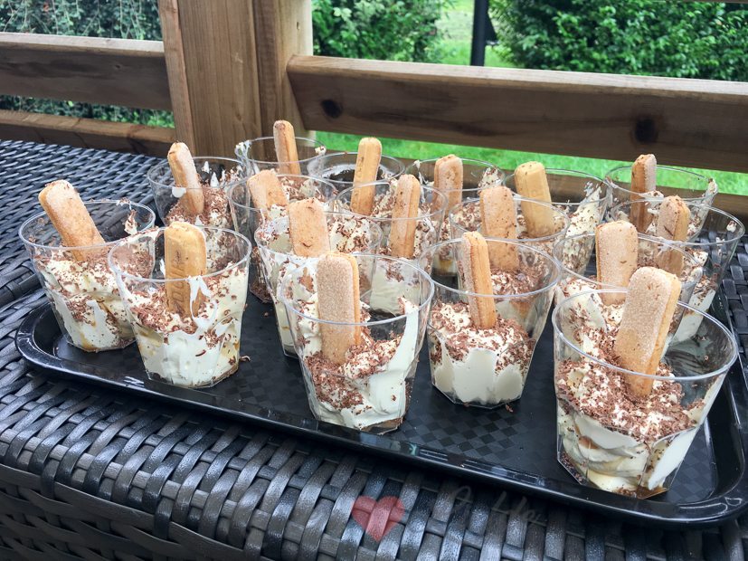 - Tiramisu glaasjes (mascarpone loskloppen met opgeklopte slagroom en suiker en in glaasjes doen. Sterke koffie mengen met caramel koffiesiroop en lange vingers erdoorheen halen. Lange vingers in de glaasjes steken en bestrooien met geraspte pure chocolade)