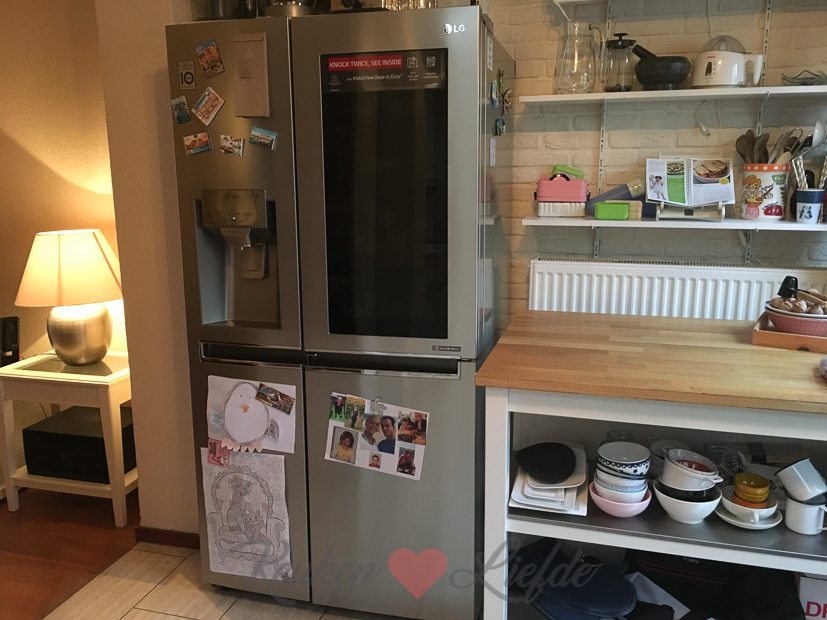 Als ik ’s middags thuiskom is éin-de-lijk onze nieuwe LG Instaview door-in-door koelkast bezorgd. De levering en het op zijn plek zetten in huis hadden wat voeten in aarde, maar uiteindelijk staat hij.