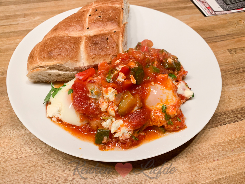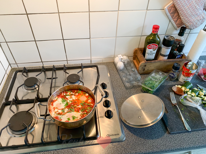 Tijd om weer een KNL-receptje te maken: op het menu staat een tomatenpannetje met courgette, puntpaprika en feta. Het lijkt veel op het Midden-Oosterse gerecht shakshuka maar dan iets eenvoudiger zonder waslijst aan kruiden en specerijen. Met wat Turks brood erbij serveer ik het ’s avonds als avondeten.